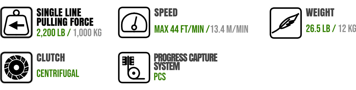This model is powered by the 360° inclinable 4-stroke Honda GX50 engine for smooth performance and reliability, offering a remarkable pulling force of 1.000 kg (2200 lb). Add a pulley system of two double pulleys; you can pull up to five times (5x) the pulling capacity, for a total of 5.000 kg (11 000 lb)!
