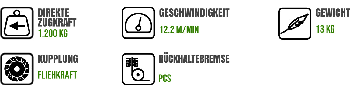 Mit einer unglaublichen Zugkraft von 1.200 kg(2.650 lb) und einer Reichweite von bis zu 6.000 kg (13.250 lb) durch den Einsatz von 2 doppelten Umlenkrollen. Unter der Registerkarte Downloads finden Sie die Anleitung.